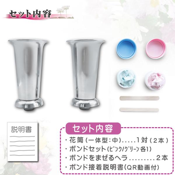 お墓用 ステンレス製花立 左右1対セット 中サイズ 石材専用ボンド・動画QRコード付き説明書で失敗しない 一体式(中) ボンド付 B0B6PB5CC1