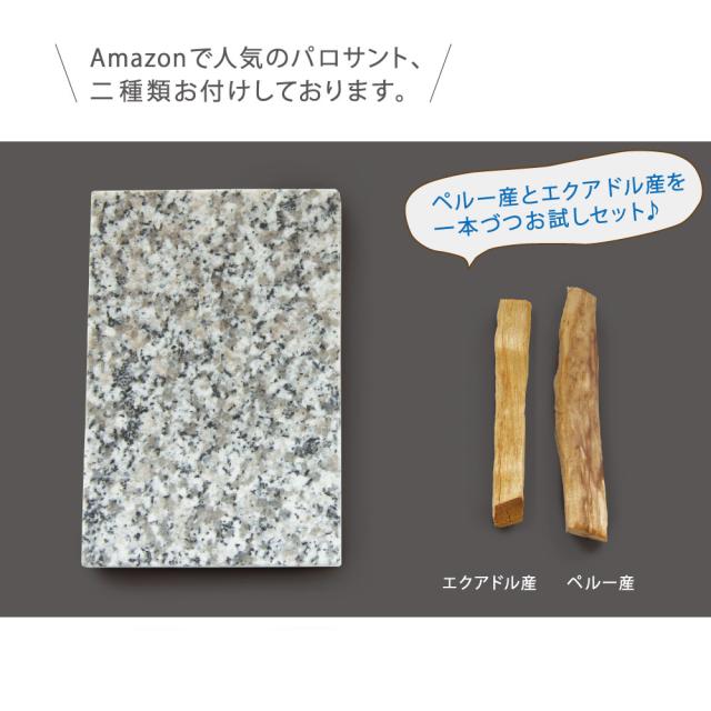Amazon人気1のパロサントスティク ペルー産1本とエクアドル産1本(計2本)、耐熱プレートのセットです。