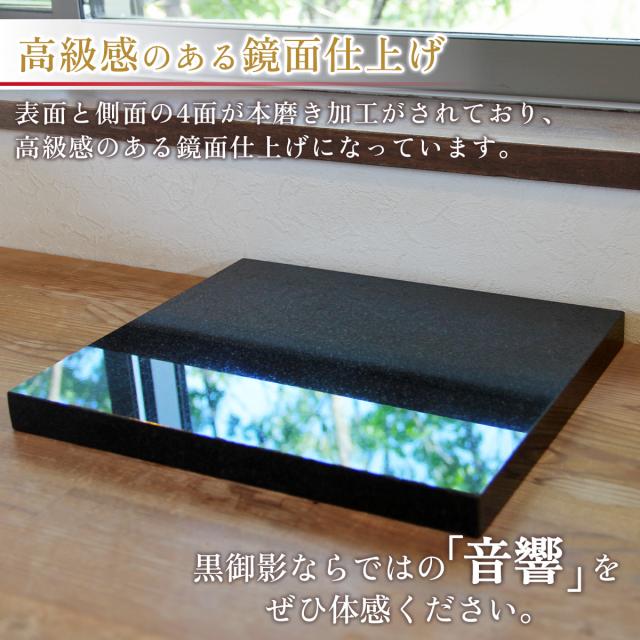 大理石よりもはるかに硬い御影石の原石、石材の中でも高価で硬く加工が難しい黒御影石から、1枚1枚加工してできた製品です。