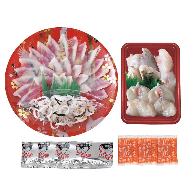 商品名 とらふぐ料理セット 容量 とらふぐ刺身40g、とらふぐ皮20g、とらふぐちり200g、ふく醤油30ml×3、もみじおろし10g×3 原材料名 ちり(加熱用)[トラフグ(長崎県産、熊本県産:養殖)]、ふく醤油[醤油、米発酵調味料、糖類(砂糖、水飴)、かつお節エキス、橙果汁、橙油/酸味料、調味料(アミノ酸等)、アルコール、カラメル色素、(一部に小麦、大豆を含む)]、刺身[トラフグ(長崎県産、熊本県産:養殖)]、もみじおろし[大根、澱粉、唐辛子、こんにゃく粉、梅酢]、皮[トラフグ(長崎県産、熊本県産:養殖)] アレルギー特定原材料 小麦 加工地 山口県 賞味期限 製造日から90日 保存方法 -10℃以下で保存してください。