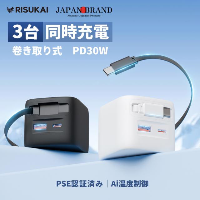 リスカイ★伸縮式充電ケーブル★ Type-C充電ケーブル付き携帯電話充電器 iPhone対応 PD 30W急速充電 USBインターフェース 伸縮式 Lightningケーブル デュアルポートアダプター データケーブル 折りたたみ式プラグ 持ち運び便利&スッキリ収納!