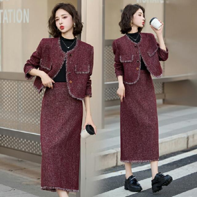 スカートスーツ 2点セット セットアップ レディース ツイード調 スカート Iライン ジャケット ノーカラー ロングスカート 長袖 春 秋 レディース ツイード調ジャケット 着痩せ