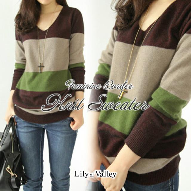 Vネックと3色ボーダー柄がとってもフェミニンな印象を♪