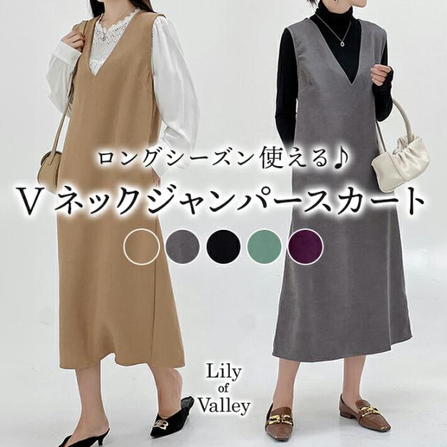 ・1着でロングシーズン使える Vネック 無地 ジャンパースカート。