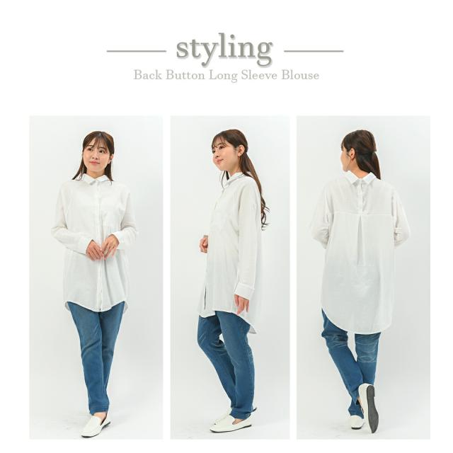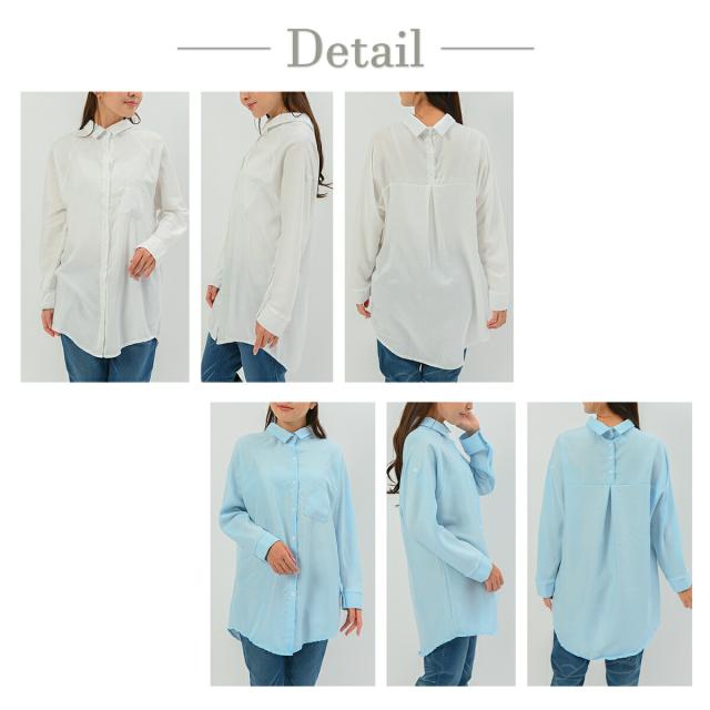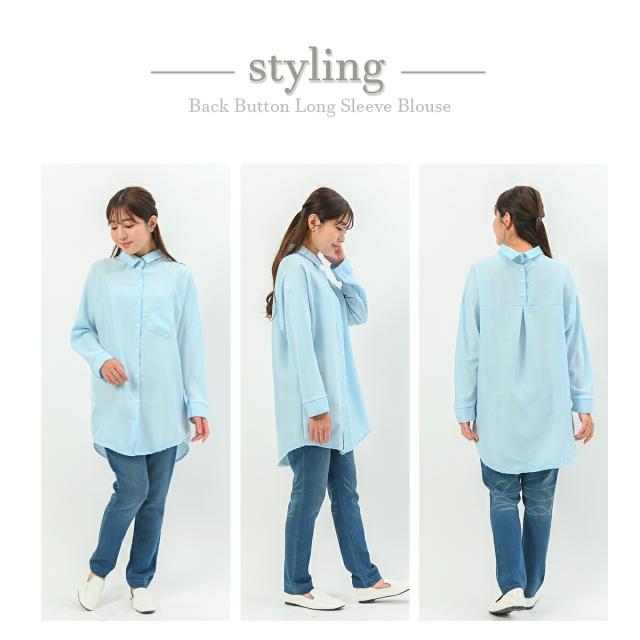 バックボタンがポイントの2WAYロングカジュアルシャツ/オーバーサイズ 綿 コットン ブラウス 長袖 ロング ゆったり オフィス 青 ブルー 白 ホワイト 大きいサイズ 襟付き 春 夏 秋
