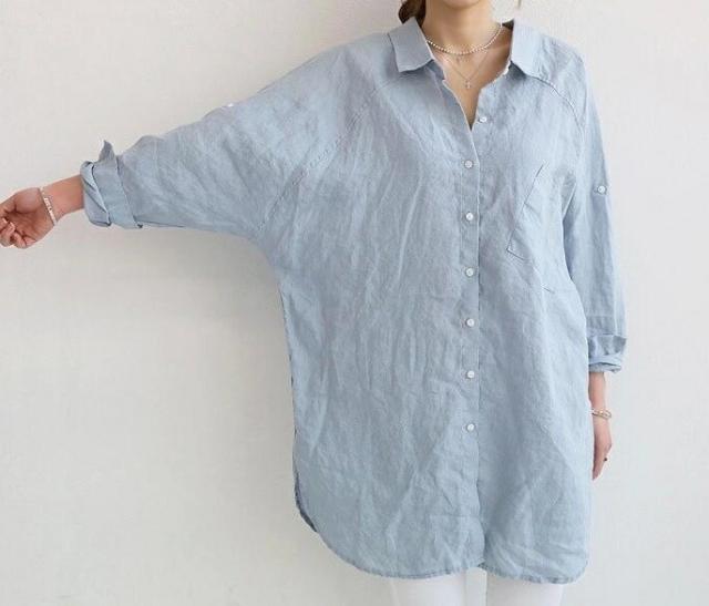 ・ 柔らかいシャツ素材がこれからの季節にピッタリ♪体のラインが響きにくいゆったりとしたシルエットも嬉しいポイント。