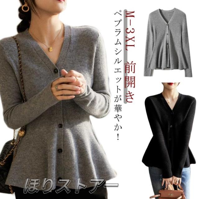 前開き カーディガン ニットプルオーバー ペプラム 長袖 ニットカーディガン ニット ニット ペプラム ペプラムカーディガン カーディガン 羽織り レディース Vネック トップス フレア フィット 上品 フェミニン 春 秋