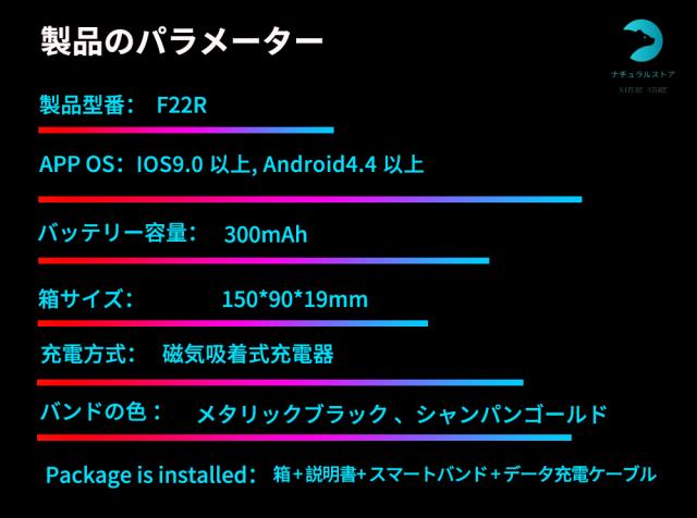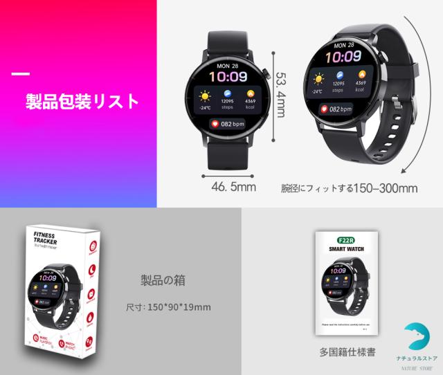 ☆閲覧いただき、誠にありがとうございます☆ 基本仕様 製品型番:F22R 重量:90g ディスプレイ:1.35インチ バッテリ容量:300mAh コネクター:マグネット吸着式 ※本製品は医療機器ではなく、測定機能付きスマートウォッチであり、測定値は参考値です。 測定された数値は、専門的な医療機器の結果と比較できるものではありません。 ○使用上の注意事項○ ※改造/本来の目的以外/強い衝撃などはお控え下さい。 ※仕様は改善の為に予告なく変更する場合があります。 ※ディスプレイ画面等の環境上、写真と実際の商品の色とは多少違う場合がございます。