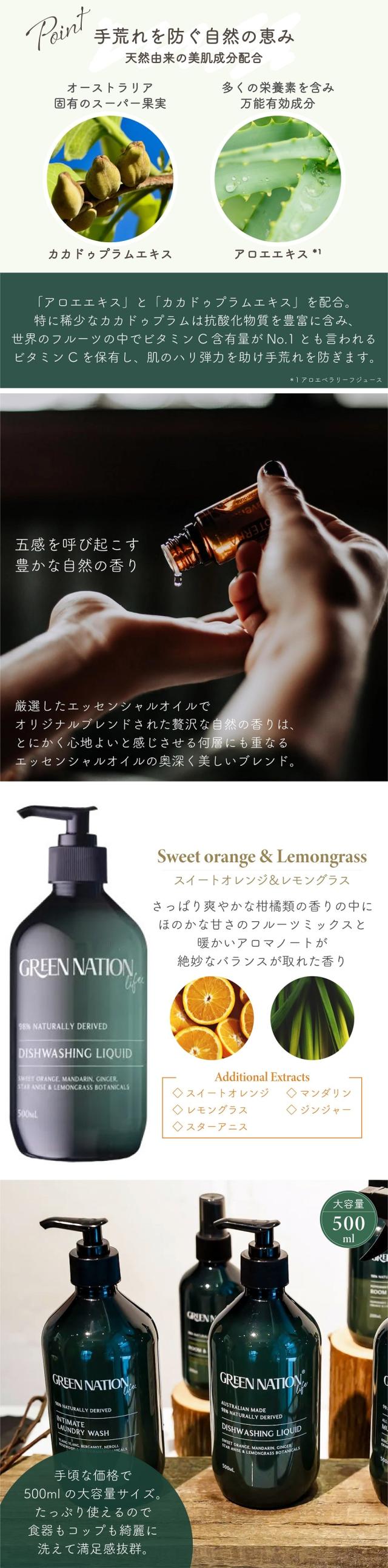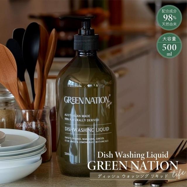 洗剤 食器用洗剤 GREEN NATION life グリーンネイション ディッシュ ウォッシング リキッド 500ml 大容量 スイートオレンジ&レモングラスの香り 98%天然由来成分 弱酸性 生分解性 エッセンシャルオイル 精油 人工香料不使用 ラベルレス 掃除用品 キッチン用品