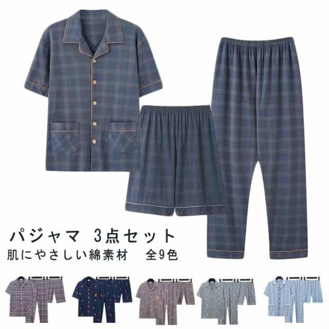 メンズ 3点セット 紳士 夏用 綿 半袖 前開き メンズ 半袖 部屋着 ルームウェア 長ズボン 男性用 パジャマ ハーフパンツ チェック柄 薄手 涼しい 入院 リラックス 寝間着 セットアップ 父の日 敬老の日 ギフト プレゼント