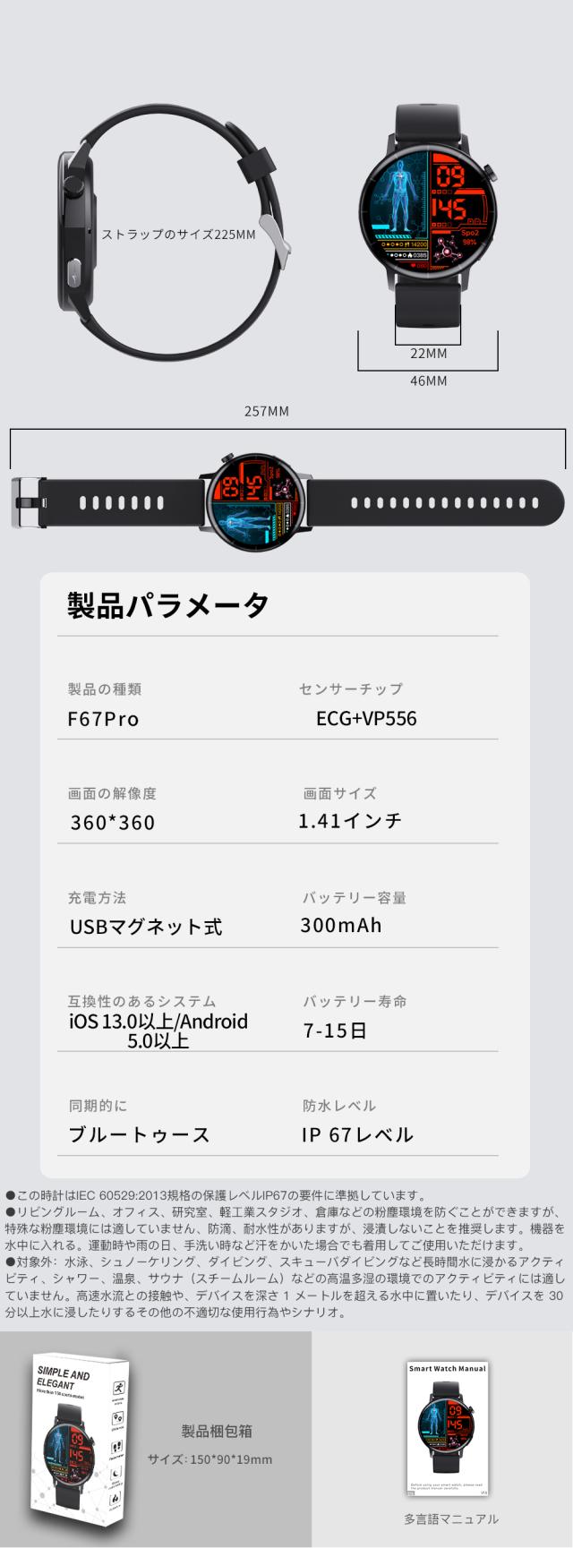 ☆閲覧いただき、誠にありがとうございます☆ 基本仕様 製品型番:F67PRO 重量:90g ディスプレイ:1.41インチ バッテリ容量:300mAh コネクター:マグネット吸着式 ※本製品は医療機器ではなく、測定機能付きスマートウォッチであり、測定値は参考値です。 測定された数値は、専門的な医療機器の結果と比較できるものではありません。 ○使用上の注意事項○ ※改造/本来の目的以外/強い衝撃などはお控え下さい。 ※仕様は改善の為に予告なく変更する場合があります。 ※ディスプレイ画面等の環境上、写真と実際の商品の色とは多少違う場合がございます。