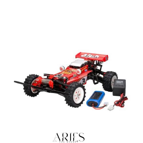 シャフトドライブ4WD、アジャスタブルタイプのモノショックダンパーを装備した前後ダブルウィッシュボーンサスペンションなど主要メカはそのままに、前後のドライブシャフトやプロペラシャフトは、信頼性の高いドッグボーンタイプに変更。 オイルダンパーも現在主流のダイヤフラムタイプとしました。また、ESCを搭載しているため、リヤのアルミヒートシンクは本来必要ではありませんが、ホットショットのリヤビューのポイントともなっているこのパーツはダミーとして装備しました。 完成シャーシにはRCメカを搭載済み、さらに、クルマの操縦に適したホイール・トリガータイプの送信機をはじめ、走行用バッテリーや専用充電器も付いて、箱から出してバッテリーを充電すればすぐに走りが可能。 現代の4WDバギーとの走り比べも楽しみです。