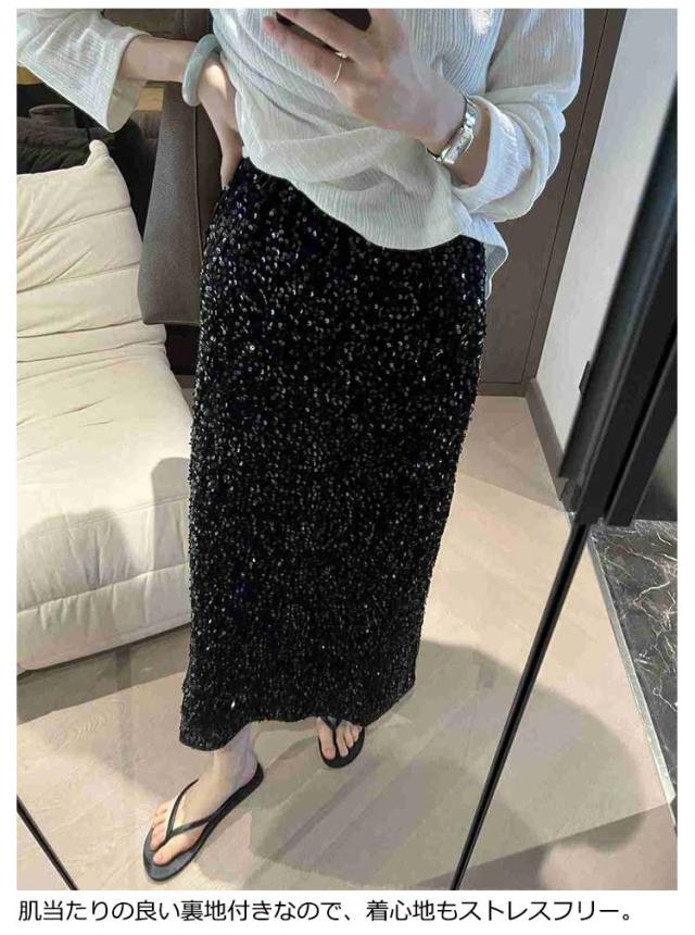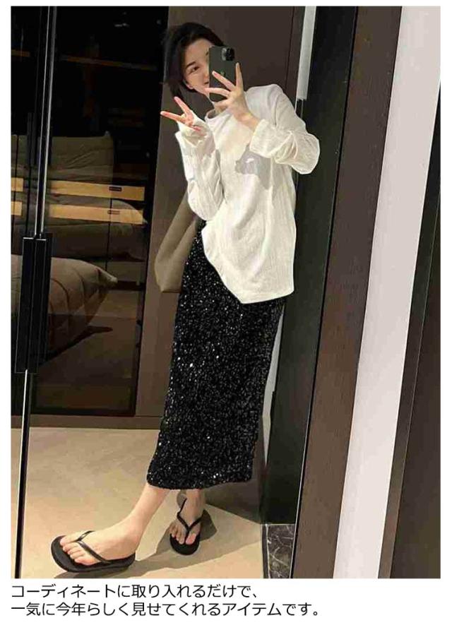 スカート スパンコールスカート タイトスカート ナロースカート ロングスカート Iラインスカート ボトムス ロング丈 ハイウエスト ウエストゴム 光沢 大人 カジュアル 秋 冬 結婚式 パーティー お出かけ 韓国 オフィス 春秋冬