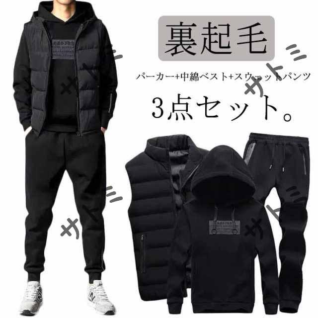 セットアップ メンズ スウェット 冬 上下セット 3点セット 裏起毛 スウェットパンツ パーカー ベスト 長袖 スポーツウェア ボア 中綿ベスト ジップアップ もこもこ 暖か トレーニング ロングパンツ フード付き ルームウェア 防寒 普段着 部屋着 厚手 防寒 秋冬 送料無料