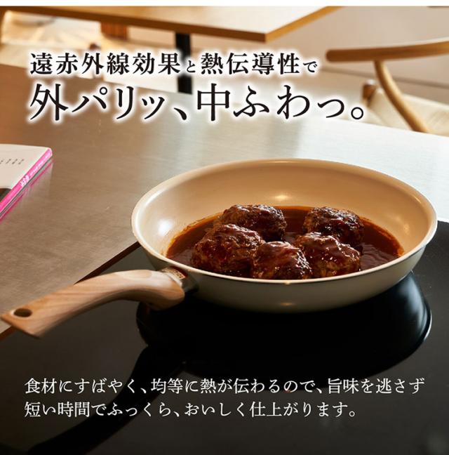 内面をセラミック加工に。遠赤外線効果と熱伝導性で食材にすばやく、均等に熱が伝わります。旨味を逃がさず、外はパリッ!中はふわっとおいしく仕上がります!