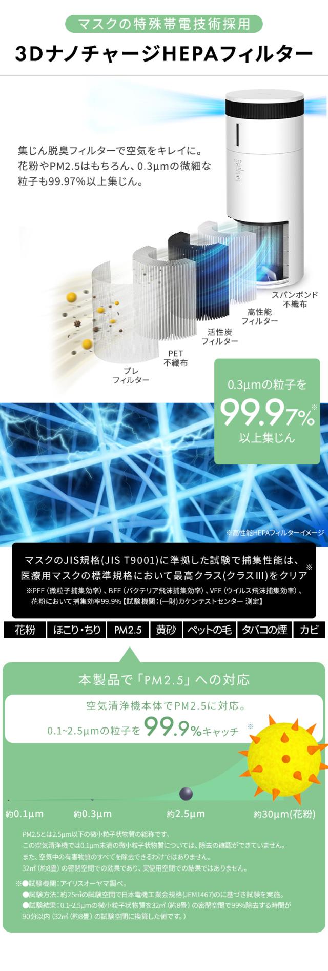 花粉やPM2.5はもちろん、0.3μmの微細な粒子も99.97%以上集じん。