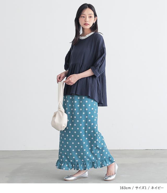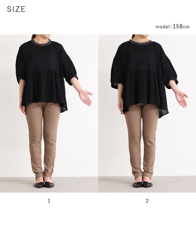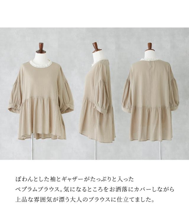『ギャザーペプラムコットンブラウス』※メール便可※【10】[ブラウス 五分袖 七分袖 レディース トップス コットン100% レース ぽわん袖 ギャザー 二の腕カバー ヒップが隠れる 春 夏 秋]