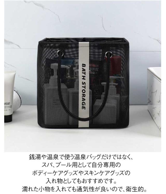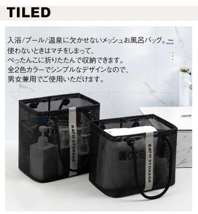 | 【水切り お風呂バッグ】【2サイズセット】【折りたたみ 持ち手付き】 入浴/プール/温泉に欠かせないメッシュお風呂バッグ。 使わないときはマチをしまって、ぺったんこに折りたたんで収納できます。 濡れた小物を入れても通気性が良いので、衛生的。 コンパクトに見えてマチがひろいのでシャンプーボトルやボディーソープ、洗顔料や厚みのあるスポンジタオルも入ります。 銭湯や温泉で使う温泉バッグだけではなく、スパ、プール用として自分専用のボディーケアグッズやスキンケアグッズの入れ物としてもおすすめです。 使わないときはマチをしまって、ぺったんこに折りたたんで収納できます。 全2色カラーでシンプルなデザインなので、男女兼用でご使用いただけます。 | |
