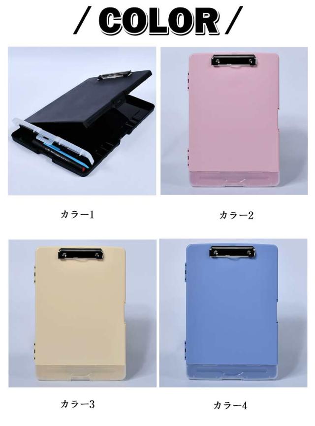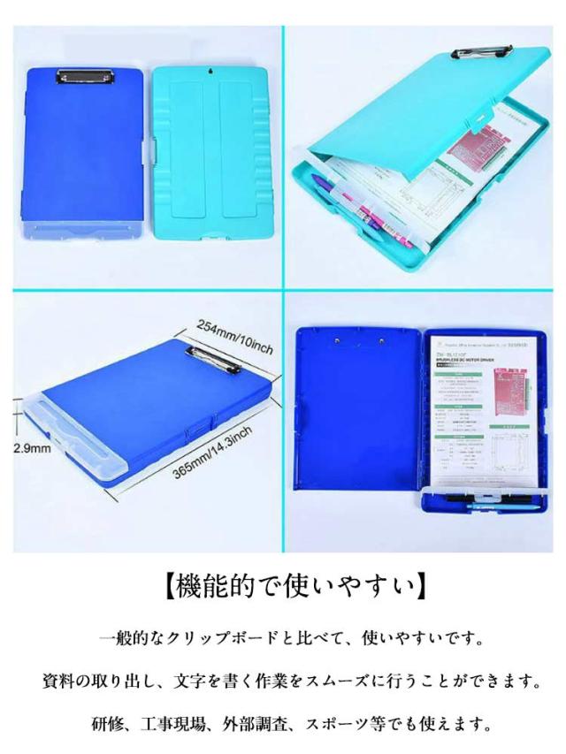 | 【抜群の収納力】 A4用紙は200枚以上収納できます。B5ノートやルーズリーフも収納可能 ボードの下部には筆記用具を収納できるポケットがあります。ペン、消しゴム、定規などを収納できます。 これだけでミーティングやセミナーに参加することが可能です。 *A4のクリアファイルは収納できません。構造上A4用紙よりも大きく作られているためです。ご了承ください。 【持ち運びに便利】 一か所に必要な文房具を収納できるので、持ち運びに便利。 またボードの裏にある溝は、指がちょうどフィットするように設計されています。 手になじむように作られています。 【機能的で使いやすい】 一般的なクリップボードと比べて、使いやすいです。 資料の取り出し、文字を書く作業をスムーズに行うことができます。 研修、工事現場、外部調査、スポーツ等でも使えます。 【保管時も場所をとりません】 裏面にフック用の穴があります。壁掛けができます。 簡単に保管できます。 【防水】 プラスチック製なので、水にも強いです。 雨の時も外で使うことができます。 | |
