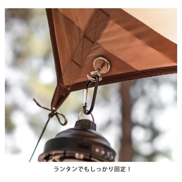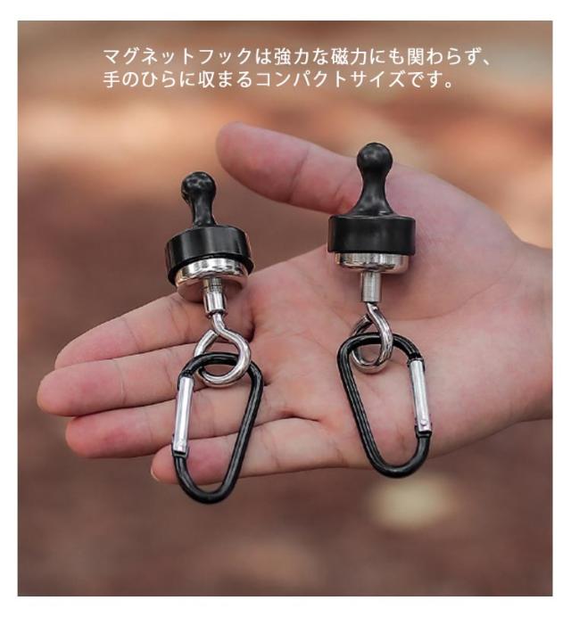 | マグネットフック 4個セット 使い方は簡単。テントやタープをニつのマグネットではさんで固定するだけ。 ランタンでもしっかり固定! マグネットフックは強カな磁力にも関わらず、手のひらに収まるコンパクトサイズです。 カラビナでかけるだけなので、簡単にランタンや小物をぶら下げることができます。さらに落ちないように返がついているので安心!! | |