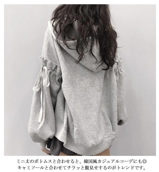 | お袖に付いたリボンが、カジュアルになりやすいパーカー 華やかでフェミニンな印象にしてくれます。 ボリューム感のあるシルエットで、華奢見えとトレンド感も◎ コンパクトな丈感でスタイルアップ効果も◎ ミニ丈のボトムスと合わせると、韓国風カジュアルコーデにも◎ キャミソールと合わせてチラッと腹見せするのがトレンドです。 | |