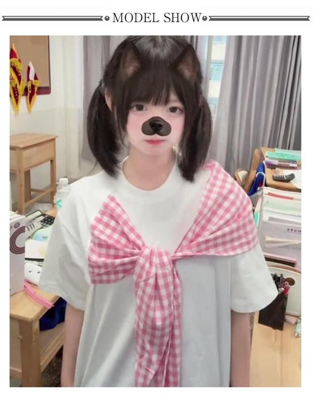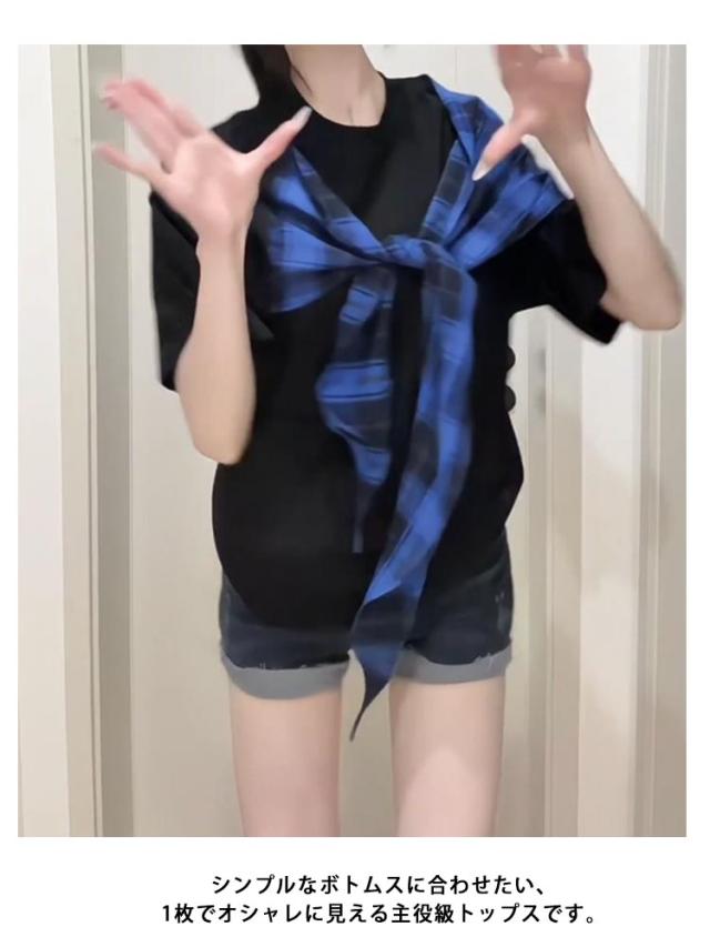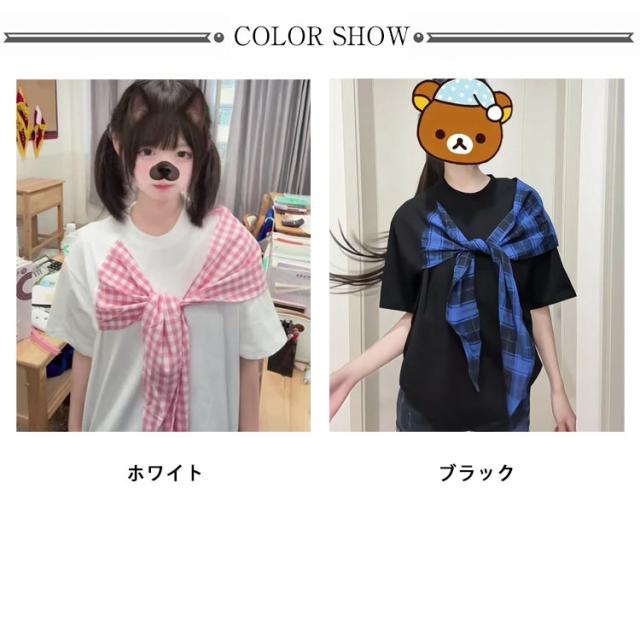 スカーフ巻きレイヤード風Tシャツ tシャツ スカーフ巻きレイヤード風Tシャツ チェック柄 半袖 レディース 斜め バイカラー デザイン トップス リボン 着やせ 体型カバー 細見え リラックス tシャツ ブラック ホワイト 無地tシャツ