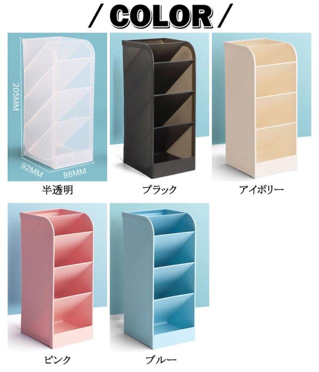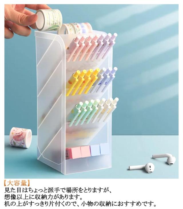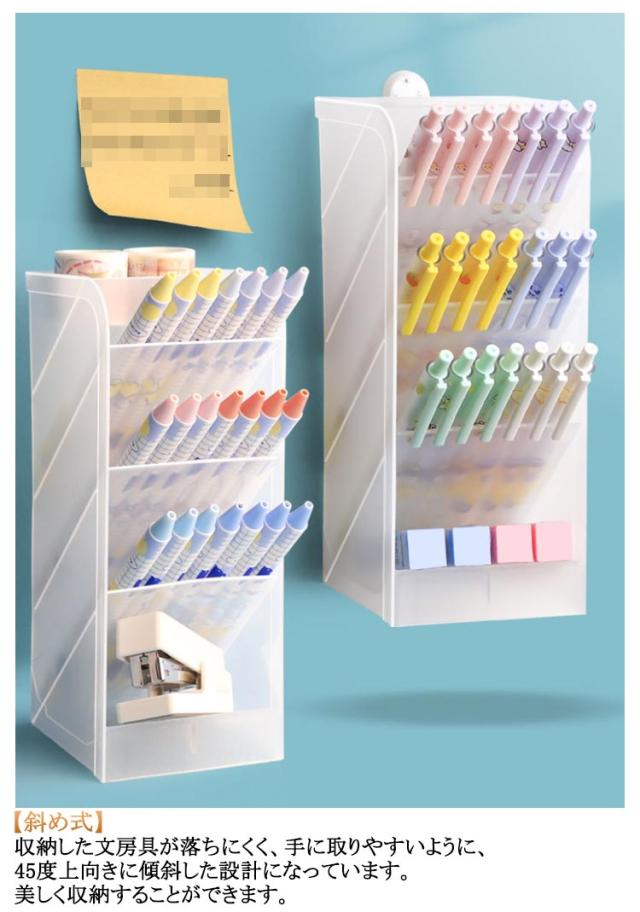 | 4段式大容量ペンスタンド。【縦置き?横置き】【斜めタイプ】【2個セット】 【斜め式】収納した文房具が落ちにくく、手に取りやすいように、45度上向きに傾斜した設計になっています。美しく収納することができます。 【大容量】見た目はちょっと派手で場所をとりますが、想像以上に収納力があります。机の上がすっきり片付くので、小物の収納におすすめです。 【多機能収納】傾斜した上段には文房具やハサミ、メイクブラシなど細長いものを、下段のラックにはキーテープなど紛失しやすい小物を収納することが可能です。 | |