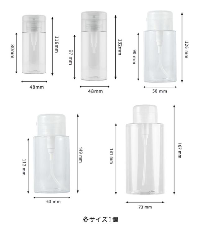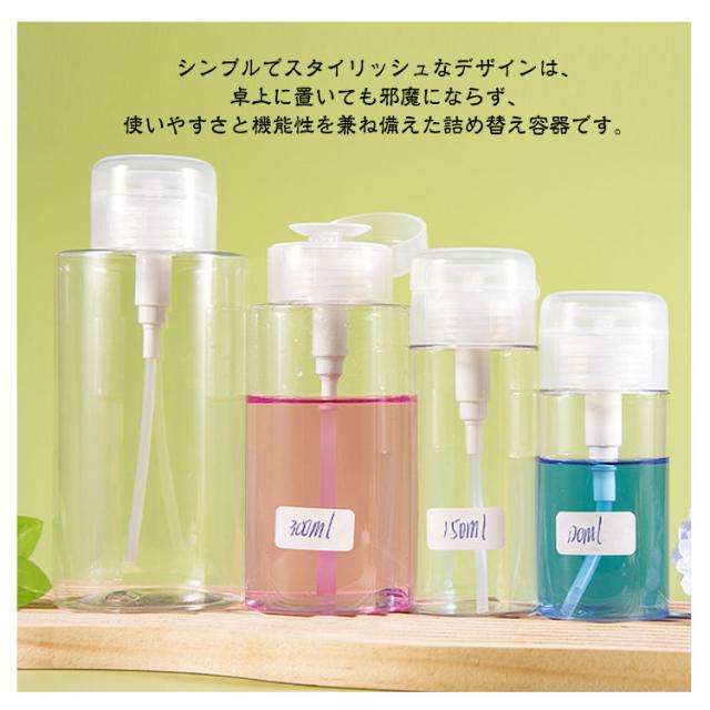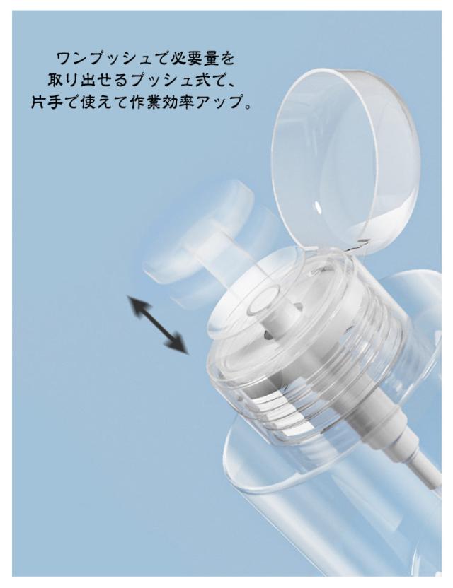 | 手軽に使える便利なポンプディスペンサーです。 【5個セット】 ワンプッシュで必要量を取り出せるプッシュ式で、片手で使えて作業効率アップ。 液体の飛び散りを防ぎ、清潔に保てるフタ付き仕様。 透明ボトルで残量確認もしやすく、120ml・150ml・200ml・300ml・500mlの5サイズから選べます。 ネイルケアやネイルオフの場面で活躍し、プロ用としてもご家庭用としてもおすすめ。 シンプルでスタイリッシュなデザインは、卓上に置いても邪魔にならず、使いやすさと機能性を兼ね備えた詰め替え容器です。 | |