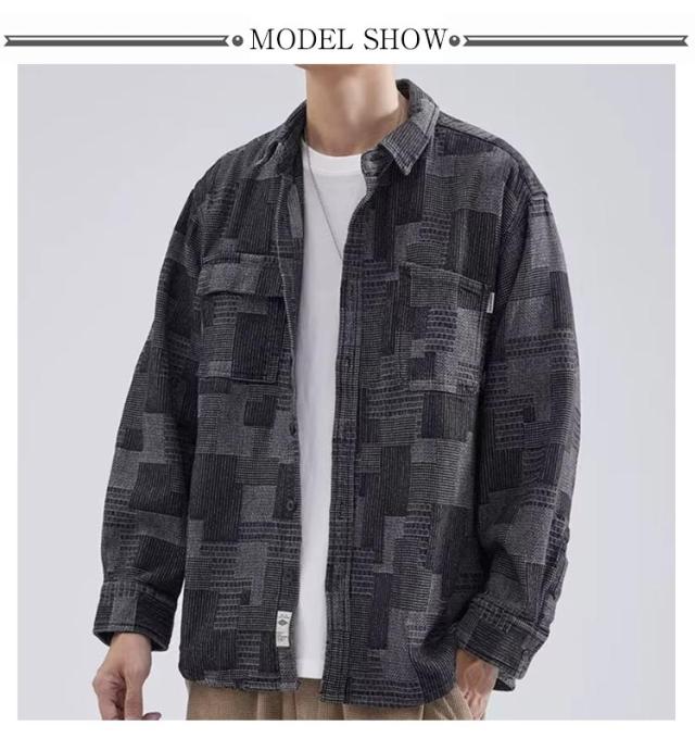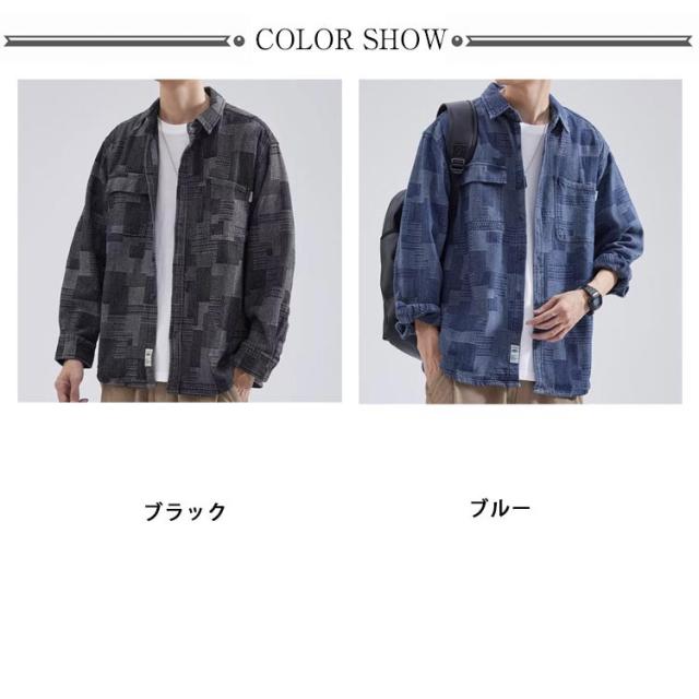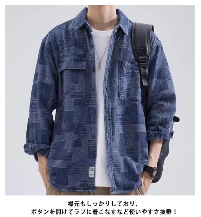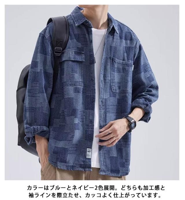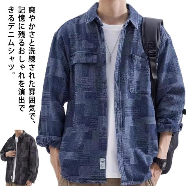 デニムシャツ デニム 長袖 カジュアル デニム ジャケット シャツジャケット メンズ シャツ ボタンダウンシャツ ワークシャツ ミリタリーシャツ ライトアウター チェック柄 パッチワーク トップス ビッグシルエット