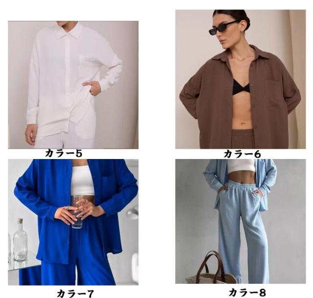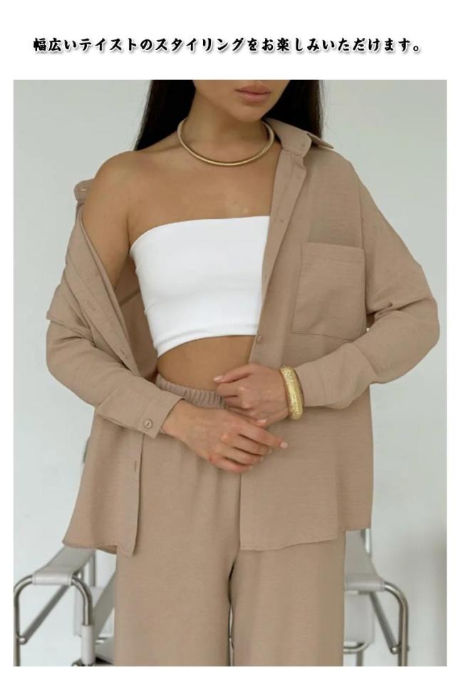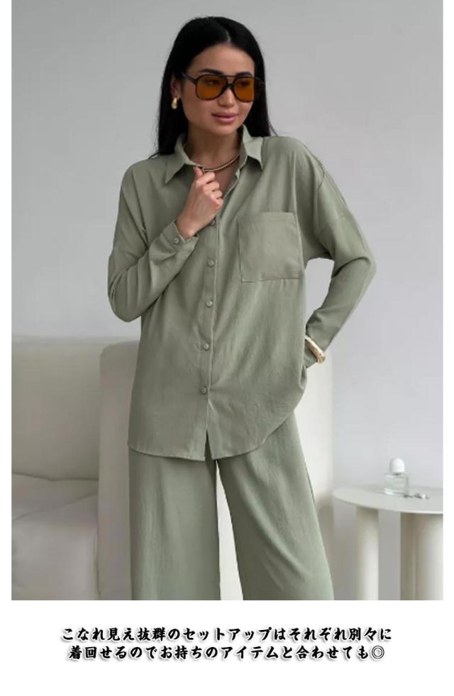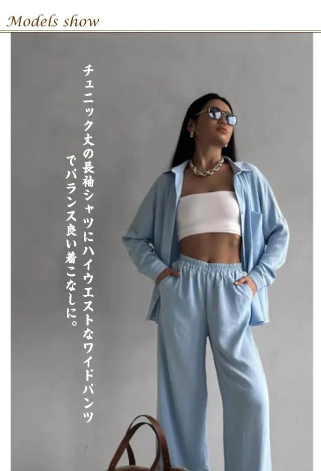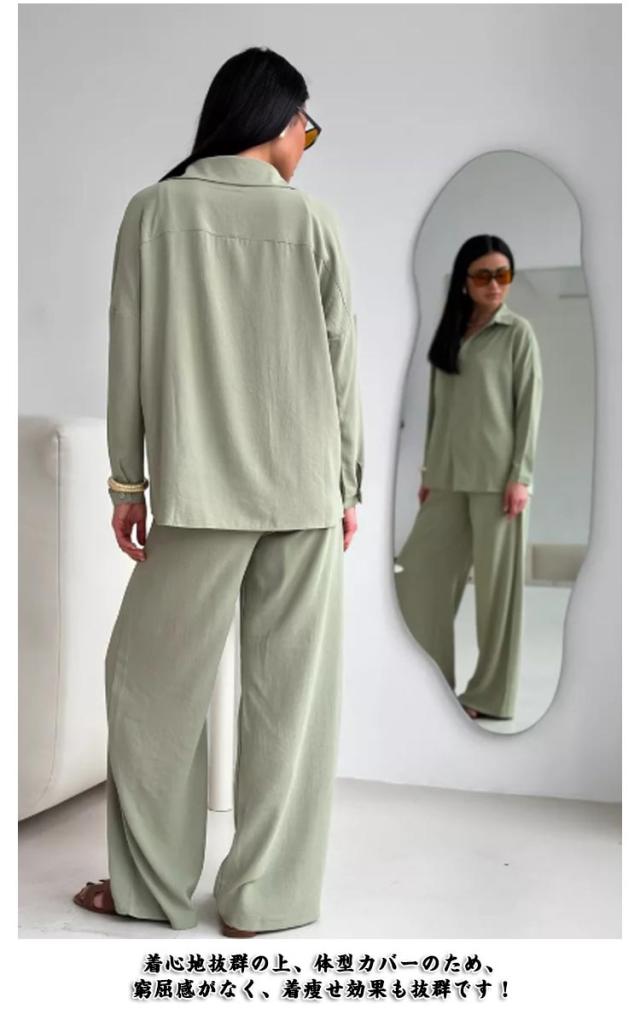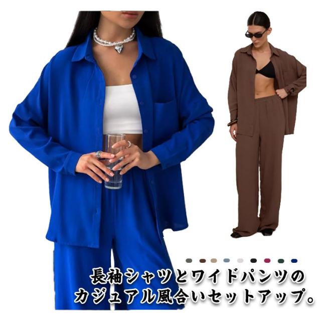 カジュアル シンプル 上下セット シャツ ワイドパンツ レディース トップス ボトムス 長袖シャツ ガウチョパンツ 体型カバー ハイウエスト ゆったり ストレート 体型カバー 女性らしい カジュアル セットアップ きれいめ