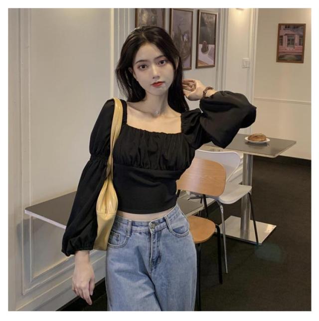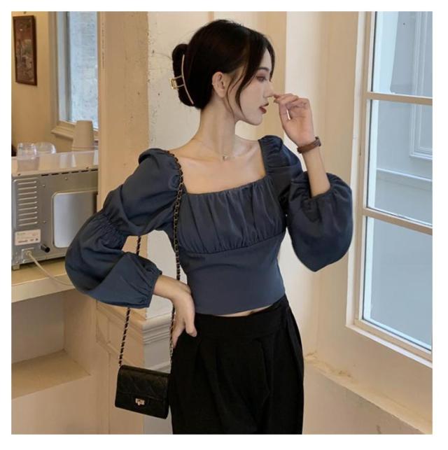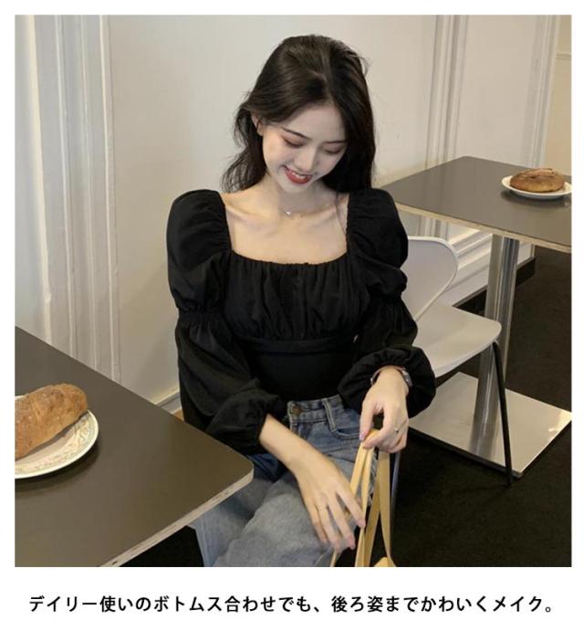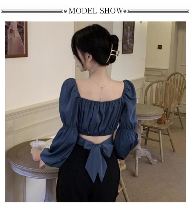 レディース ブラウス バックリボン シャーリングTシャツ トップス ボリューム袖 クロップド丈 ショート丈 ふんわり ギャザー ウエストリボン チラ見え お出かけ かわいい おしゃれ トレンド 通勤 オフィス ブラウス 着回し 春