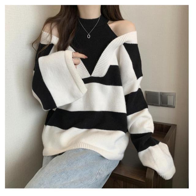 ドルマンスリーブ 体型カバー ニット フェイクレイヤード オフショルダー 肩出し 重ね着風 セーター ニット 長袖 トップス バイカラー 肩見せ レデイース ボーダーニット セーター お尻が隠れる シンプル きれいめ カジュアル オフィス