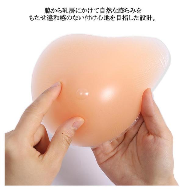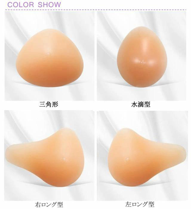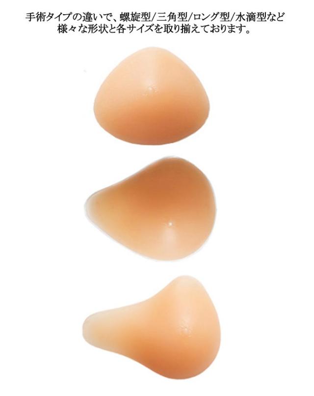 | 300g~400g 専用カバー付き! 安心、安全な医療用シリコン素材で、なめらかな肌触りと自然な弾力性、適度な重みで左右のバランスを整え身体の負担を軽減。 裏側には凹みがあり、蒸れにくい設計。 脇から乳房にかけて自然な膨らみをもたせ違和感のない付け心地を目指した設計。 裏側にあえて凹みを作る事により、空気の流れをよくし長時間着用時の蒸れを軽減。 ポケット付き専用下着でなくとも、お持ちの通常のブラジャーで問題ございません。 カバーは丸洗いできるから、いつも清潔に。 手術タイプの違いで、螺旋型 三角型 ロング型 水滴型など様々な形状と各サイズを取り揃えております。 身体の状態に合ったものをお選びいただけます。 | |