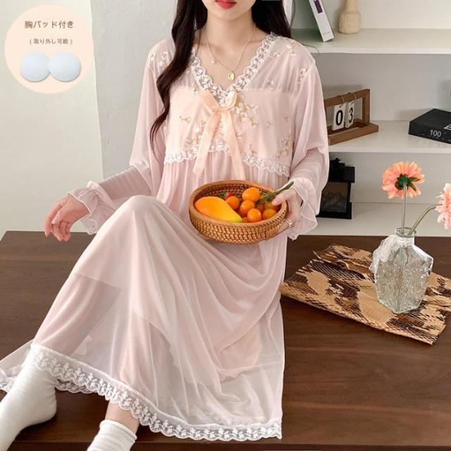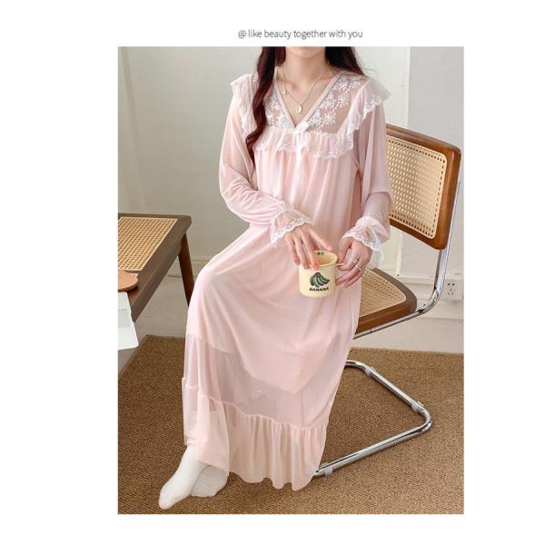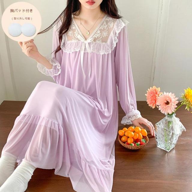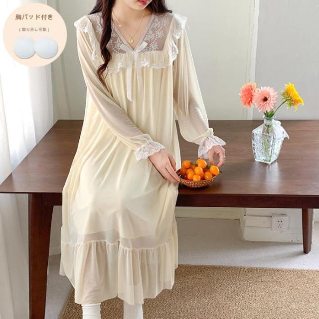 ネグリジェ ロング 姫 ワンピース パジャマ レディース ナイトドレス 春 夏 長袖 かわいい ルームウエア 可愛い おしゃれ 部屋着 寝間着 シースルー