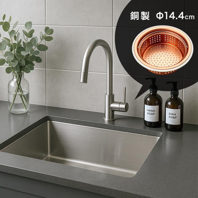 銅製ゴミカゴは、銅イオンの優れた抗菌力でぬめりを抑え、毎日清潔なシンクまわりを保ちます。