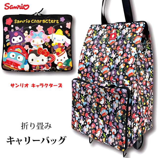 送料無料 サンリオ 折り畳み キャリーバッグ 保冷 保温 キティちゃん クロミ ポチャッコ マイメロディ シナモロール ハンギョドン 招き猫 獅子舞 縁起 買い物 レジカゴ 軽量 コンパクト 折りたたみ キャスター付き タイヤ付き キャンプ BBQ 和柄 和風 黒 ブラック