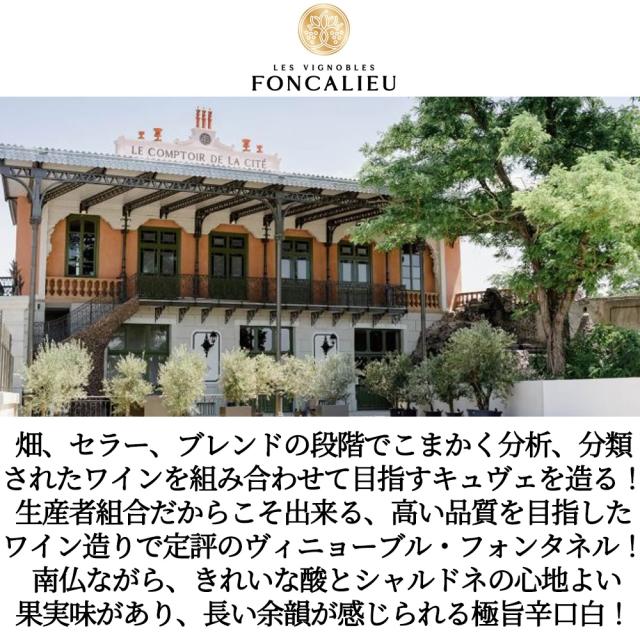 畑、セラー、ブレンドの段階でこまかく分析、分類されたワインを組み合わせて目指すキュヴェを造る!生産者組合だからこそ出来る、高い品質を目指したワイン造りで定評のヴィニョーブル・フォンタネル! 南仏ながら、きれいな酸とシャルドネの心地よい果実味があり、長い余韻が感じられる極旨辛口白!