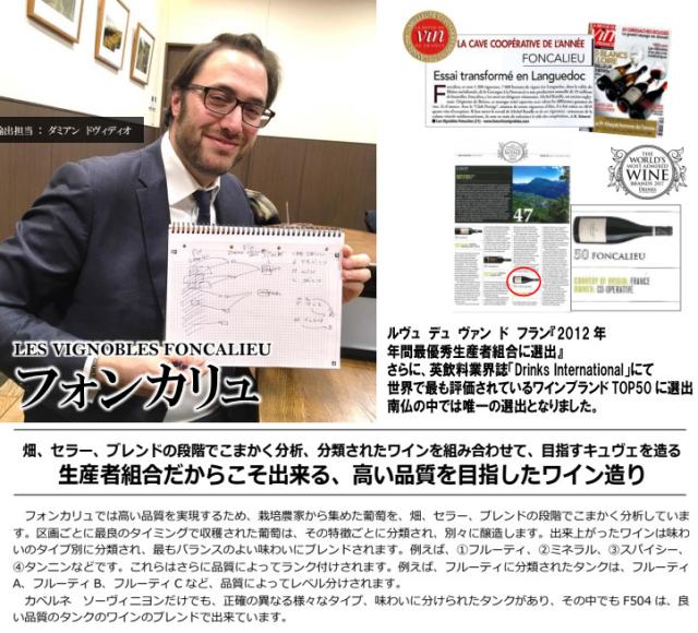 | フォンカリュの名は、メンバーの村からとったものです:フォンティエス ドート(Fonties d’Aude)、カパンデュ(Capendu)、アルゾンヌ(Alzonne)、モントリュー(Montolieu)「年間を通して農家を細かく指導。タンク管理やブレンドもデータでチェック」・・それぞれの地域の畑の葡萄を、7ヶ所ある醸造所に持って行き、醸造を行います。各醸造所のワインは、ヘッドワインメーカーのダルマニヤックとトップアグロノミストのガブリエール ルッチがチェックしています。この2人は年間を通して農夫達に畑や区画ごとに細かい指導も行います。フォンカリュのラボで品質をチェックし、レンジごとに分けます。ブレンドなどの指示は、全てラボから細かく行い、タンクの管理などもデータに基づいて行います。酵母は、選別酵母を使用しています。農家から購入した葡萄は全てをワインにしますが、1/3はバルクワインとして販売しています。また、全体の58%を輸出しています。 「世界で賞賛される生産者組合」・・フランスのワイン専門誌「ラ ルヴュ ド ヴァン ド フランス」の『2012年度年間最優秀ワイン生産者組合賞』を受賞。また、2015年に、ドイツのワイン専門誌「マイニンガー」で、『フランスの最高の生産者組合20』のトップに選出。さらに、「ドリンクス インターナショナル2017.4」で、『世界で最も評価されているワインブランド50』のひとつに選出。南フランスからは、フォンカリュが唯一選ばれました。国際品質規格のBRC(英国小売業協会)/IFS(国際食品規格)において最高レベル(AA)の認証を得ています。 |