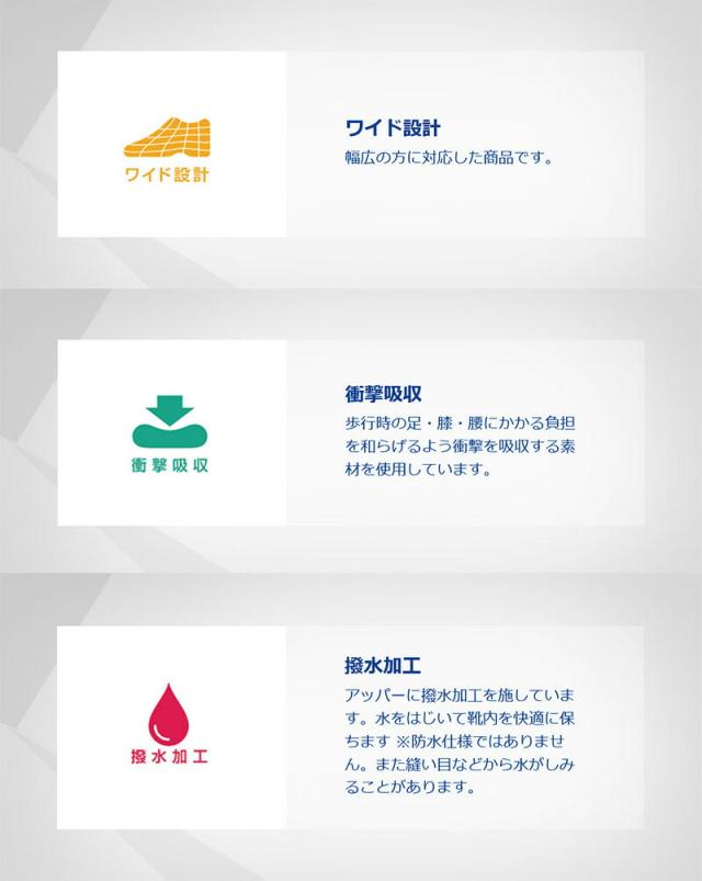 アッパーに撥水加工を施しています。水をはじいて靴内を快適に保ちます。※防水仕様ではありません。また縫い目などから水がしみることがあります。