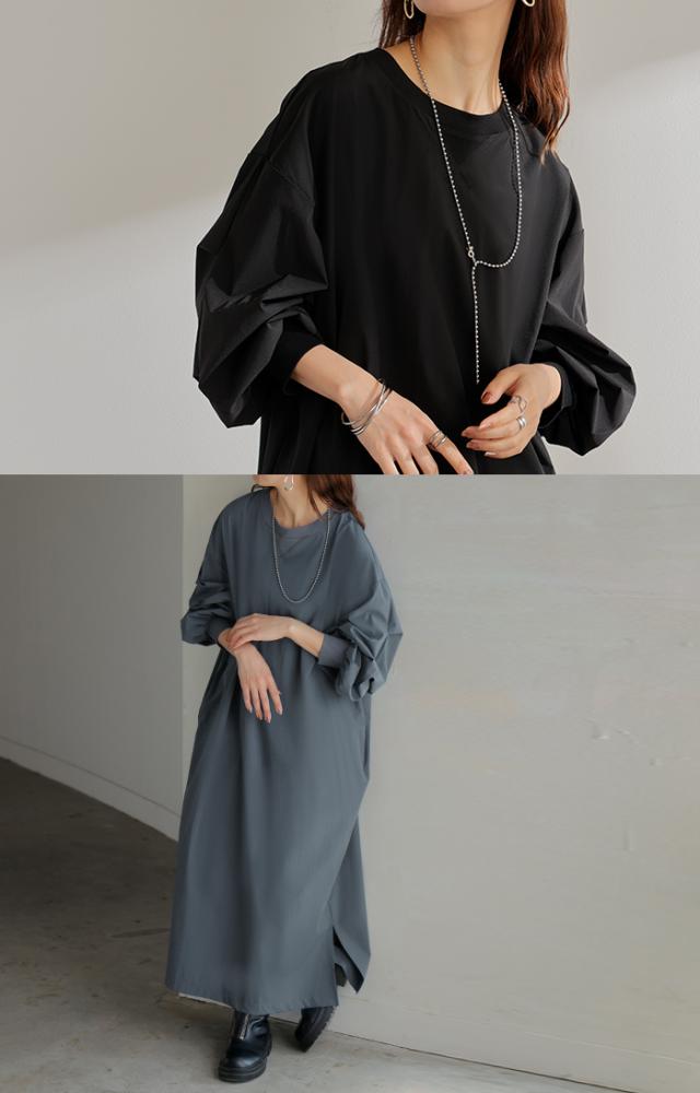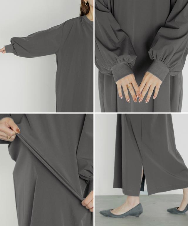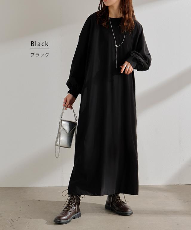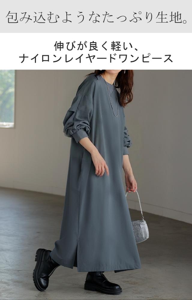 2025AW新作 ワンピース ロング ナイロン ワンピ レディース ナイロンワンピース ロングワンピース Aライン マキシワンピース ボリューム袖 ロングワンピ レイヤードワンピース 体型カバー 大きいサイズ 無地 黒 グレー 軽量 ストレッチ 秋 冬 HUG.U 秋新作