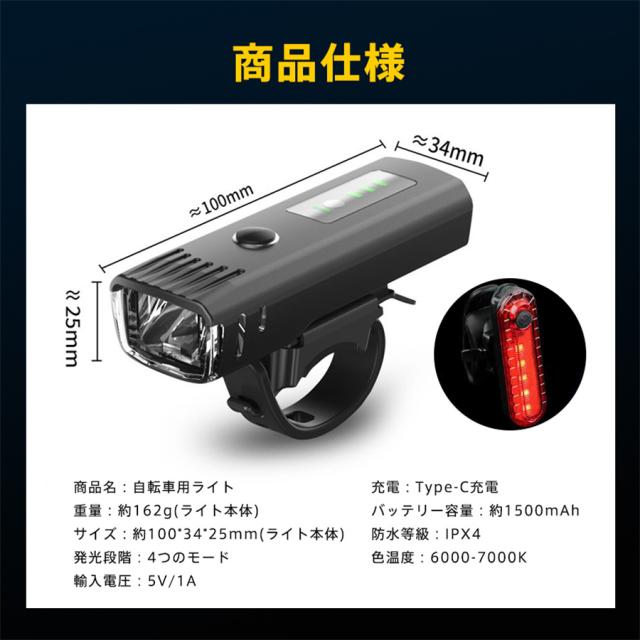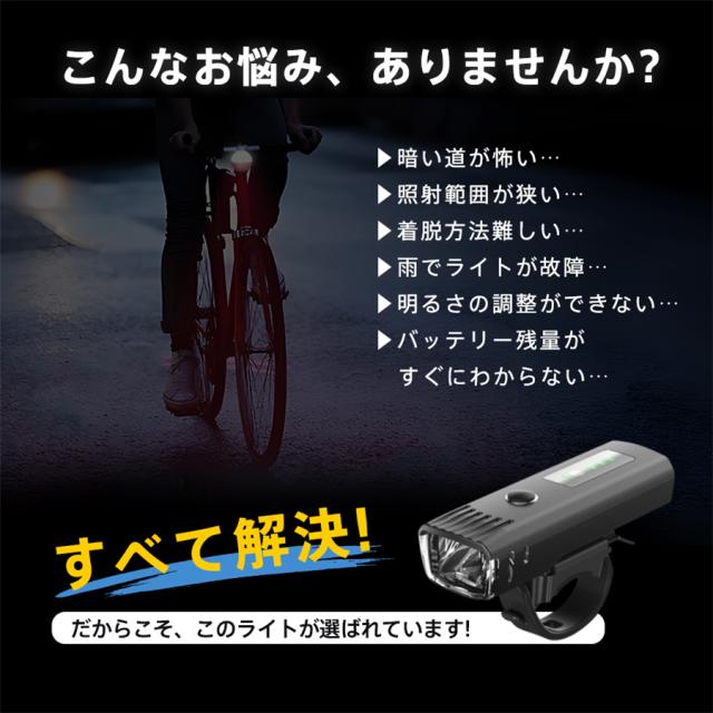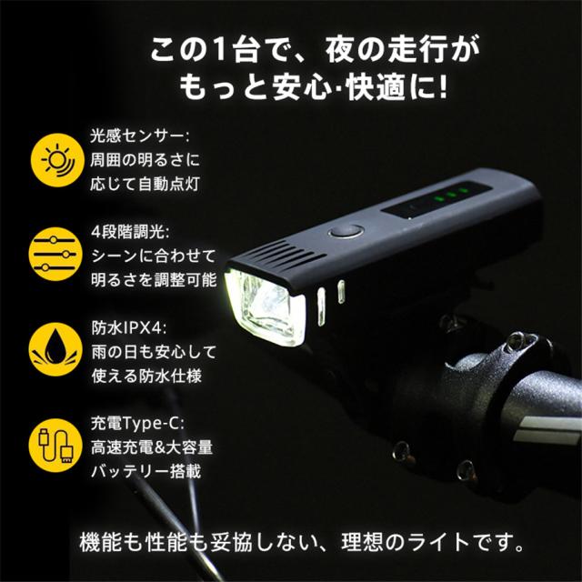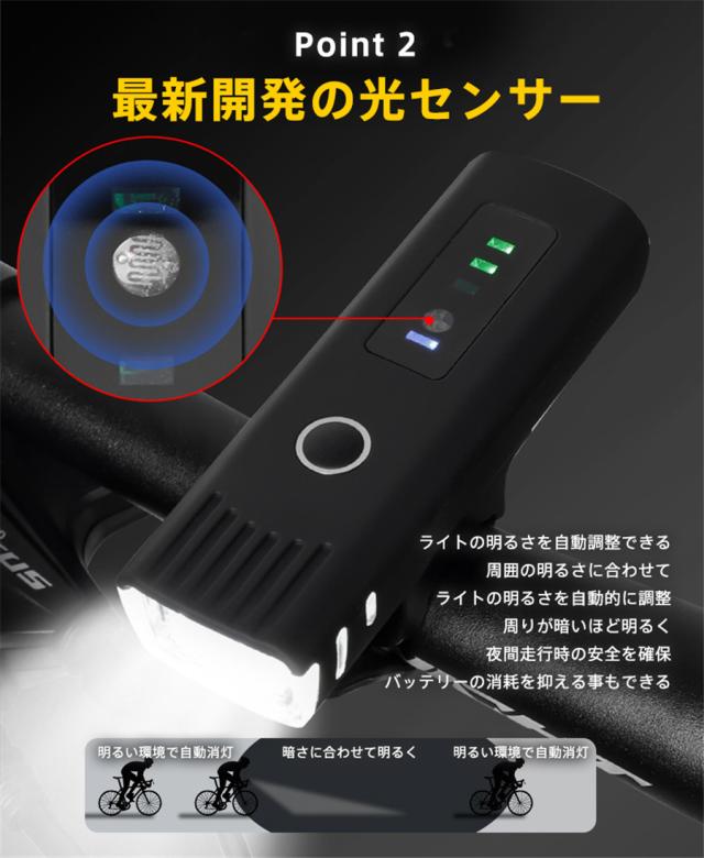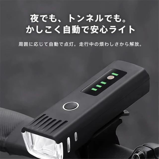 自転車ライト 自転車用ライト 感光センサー 高輝度 懐中電灯 USB充電式 電池残量表示 3段階照明モード 自動点灯 明暗センサー