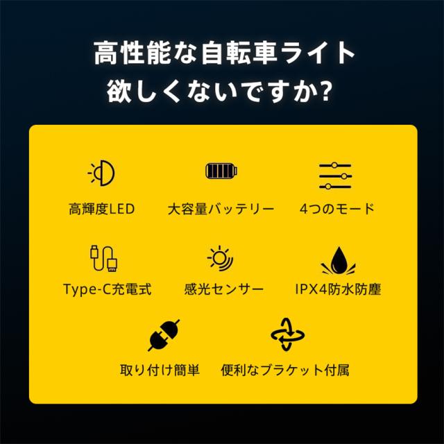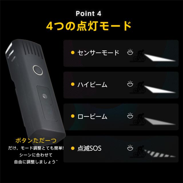 ★検索キーワード:自転車 ライト 自転車用ライト 自転車ライト 4段階照明モード 感光センサー 高輝度 小型 自動点灯 子供 通学 通勤 明るい LED USB充電式 電池残量一目瞭然 明るさ自動調整 防水 防眩 防塵 軽量 コンパクト 防眩設計 着脱簡単 夜間走行 明るい ヘッドライト 懐中電灯