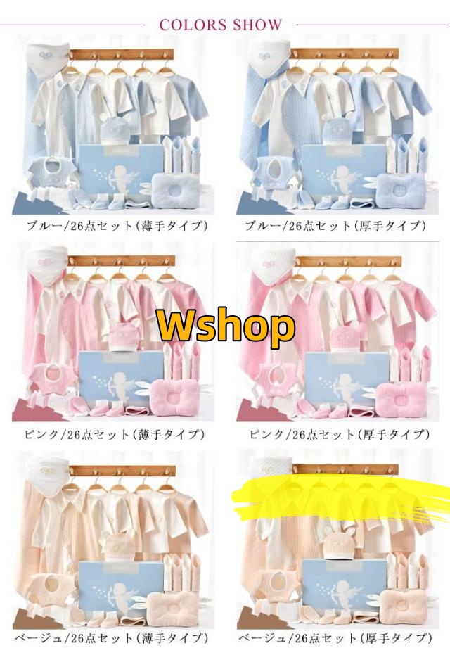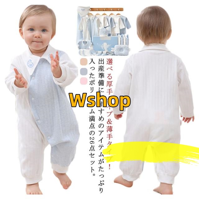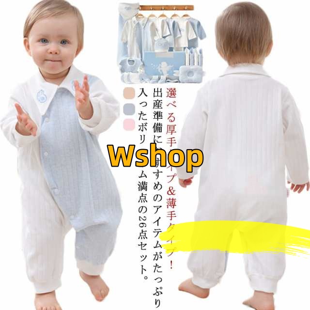 | 出産準備におすすめのアイテムがたっぷり入ったボリューム満点の26点セット。 オールシーズンお使いいただける、厚手タイプと薄手タイプをご用意しました。 赤ちゃんのデリケートなお肌に安心のコットン素材を使用。 生まれてすぐから着用出来ますので、退院の時やお披露目にも大活躍。 出産準備はもちろん、赤ちゃんとの記念日を彩るセレモニーアイテムとしても活躍! | |