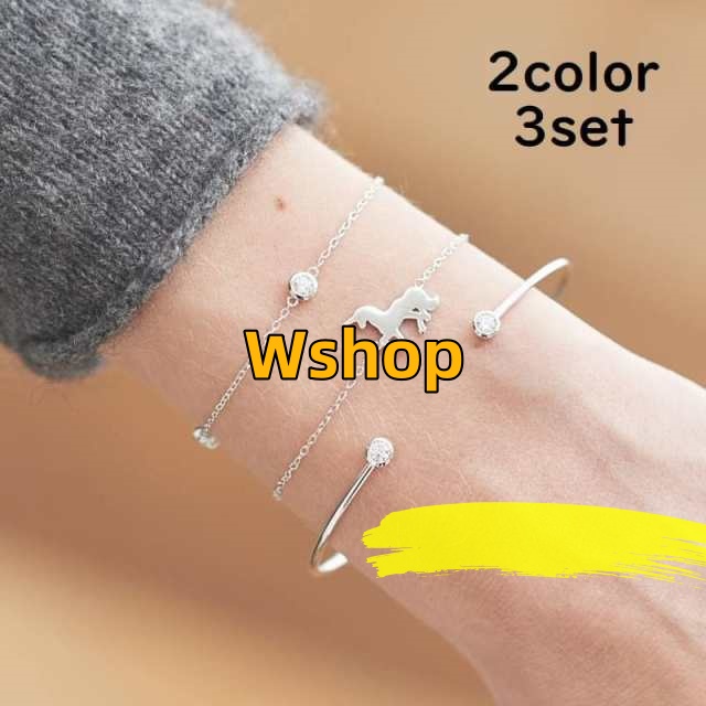 ユニコーン おしゃれ ゴールドカラー バングル 3点セット ブレスレット シルバーカラー シンプル レディース アクセサリー ラインストーン チェーン
