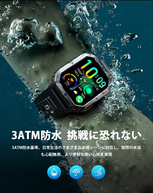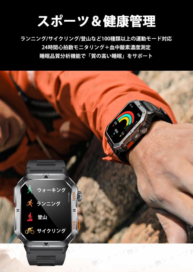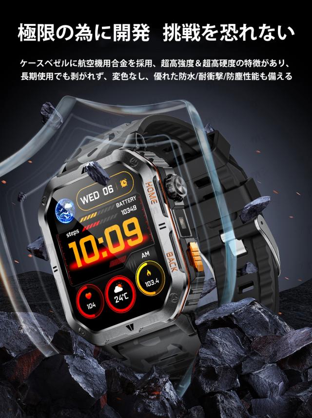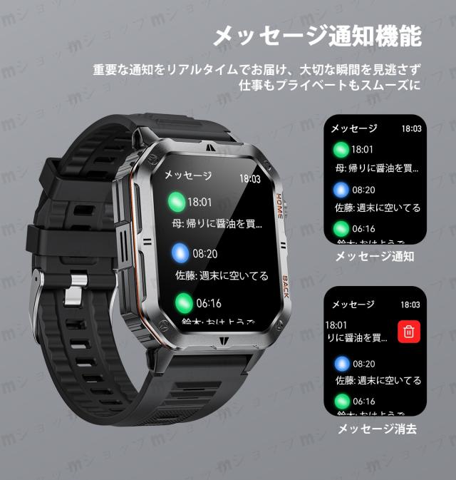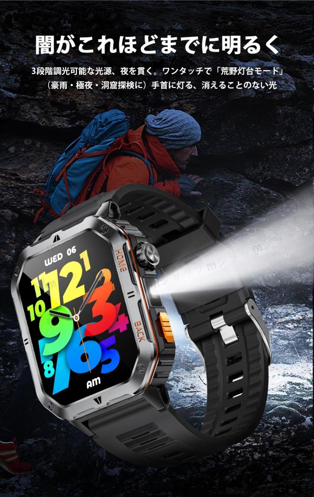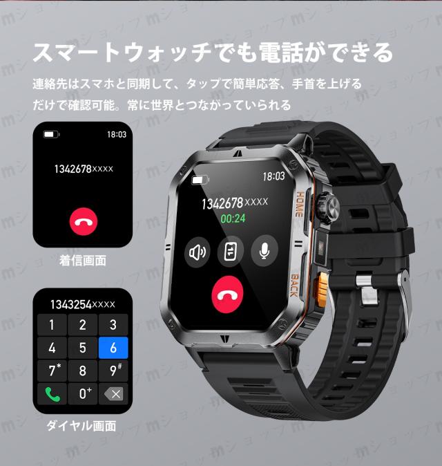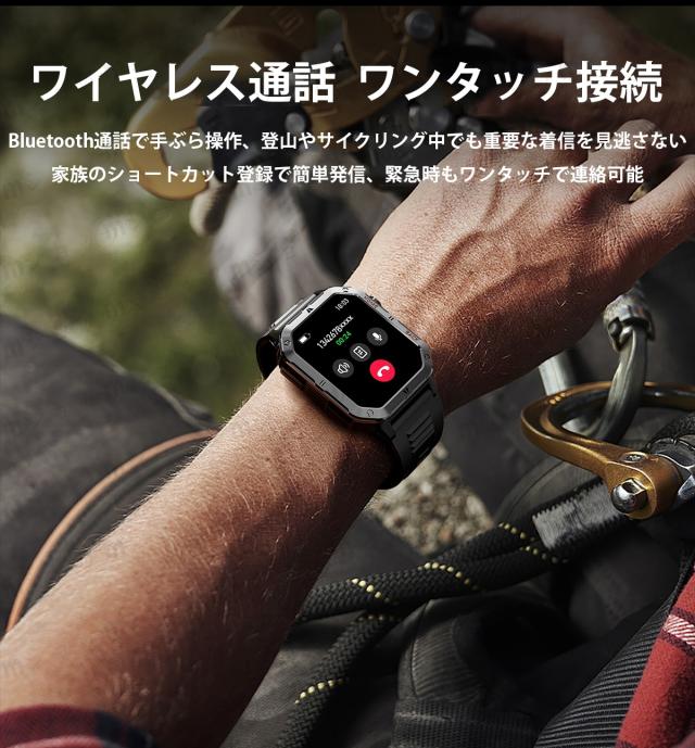 スマートウォッチ 軍用規格 日本製センサー バッテリー容量1000mAh 通話機能 着信通知 歩数計 心拍数 睡眠管理 音楽再生 カメラ制御 天気予報 懐中電灯 運動モード iPhone対応 android対応