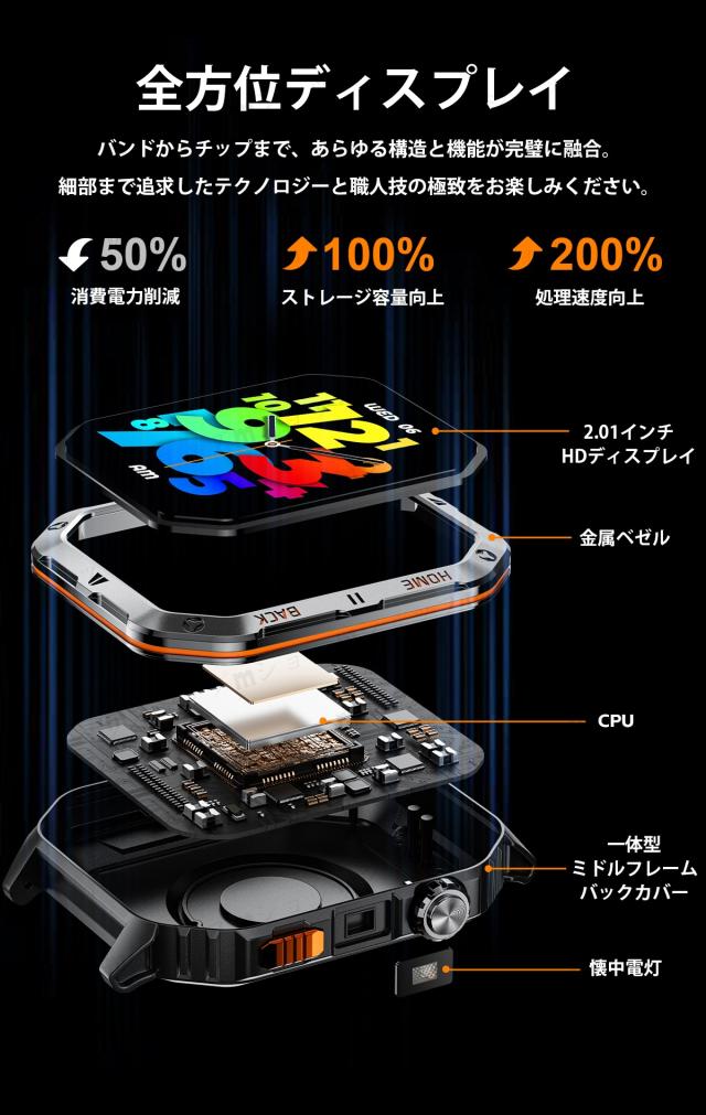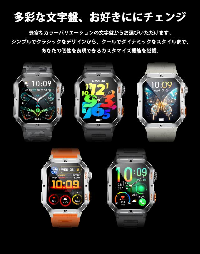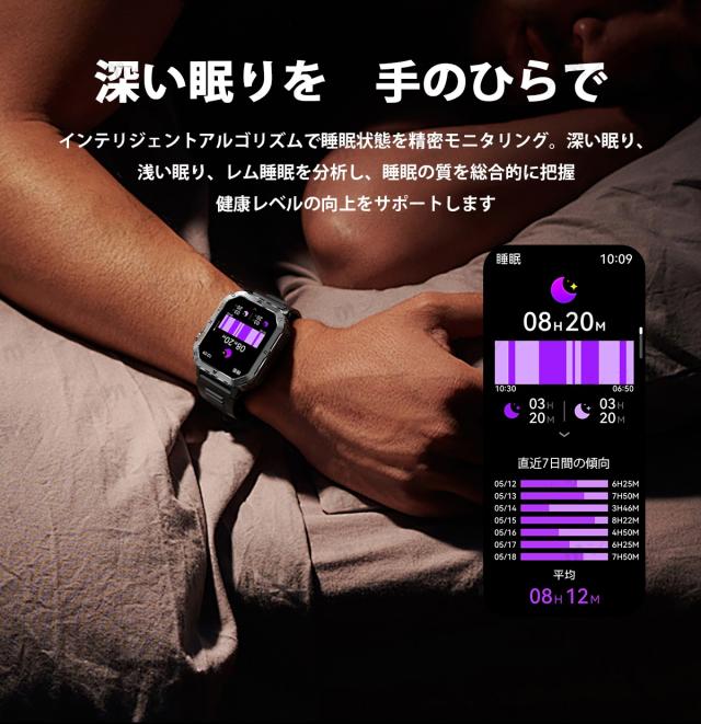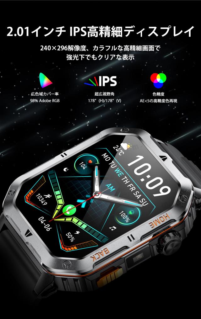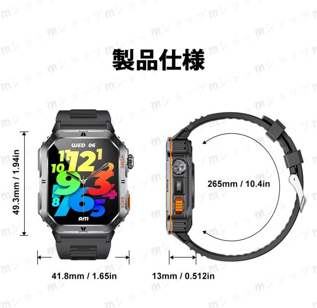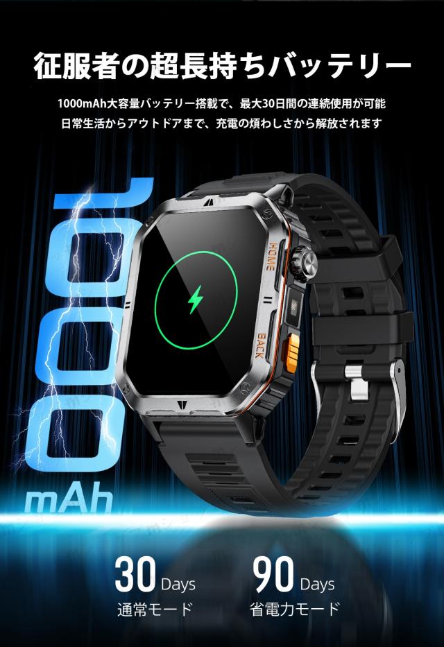 スマートウォッチ 軍用規格 日本製センサー バッテリー容量1000mAh 通話機能 着信通知 歩数計 心拍数 睡眠管理 音楽再生 カメラ制御 天気予報 懐中電灯 運動モード iPhone対応 android対応