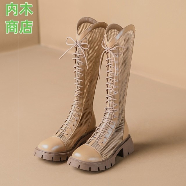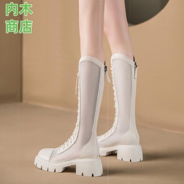 ロングブーツ シースルー ブーツ 厚底 レディース メッシュ 美脚 歩きやすい 編み ブーツサンダル 編み上げ 透け感 サマーブーツ