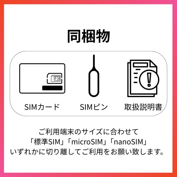 本商品はSIMフリー端末・SIMロック解除済のiPhone・iPad・スマホ・タブレット・Wi-Fiルーターでご利用いただけます。また本商品はデータ通信専用です。音声通話、SMSのいずれもご利用いただけません。ご注文確定後のキャンセルおよび発送後の返品または返金は出来かねますのでご注意ください。SIMフリー端末は予め多くの端末に対応するよう設計されておりますが当店では全SIMフリー端末での動作検証及びご利用保証は実施しておりません。