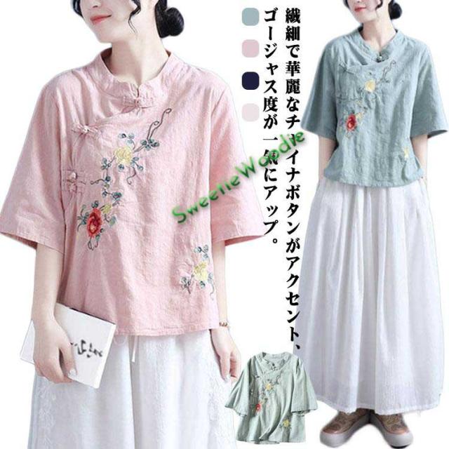 ブラウス Tシャツ チャイナカラー レディース 無地 半袖ブラウス チャイナ風 リネン 斜めボタン 七分袖 綿麻Tシャツ 綿 麻 麻生地 中国風 刺繍