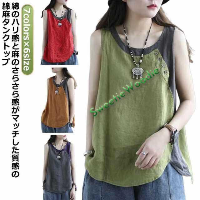 レディース レディース タンクトップ サマータンク 綿麻トップス 綿麻 オーバーサイズ 無地 ブラウス 切り替え タンクトップ ボタン付き 薄手 配色